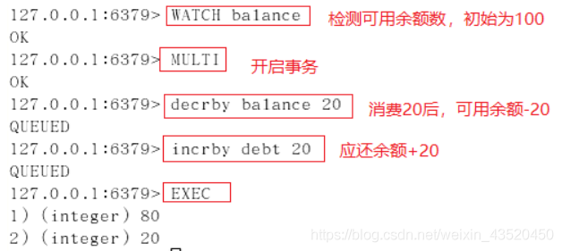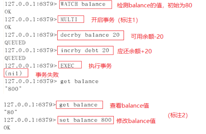 案例二:使用 watch 检测 balance,在开启事务后(标注 1 处),在新窗口执行标注 2 中的操作,更改 balance 的值,模拟其他客户端在事务执行期间更改 watch 监控的数据,然后再执行标注 1 后命令,执行 EXEC 后,事务未成功执行。