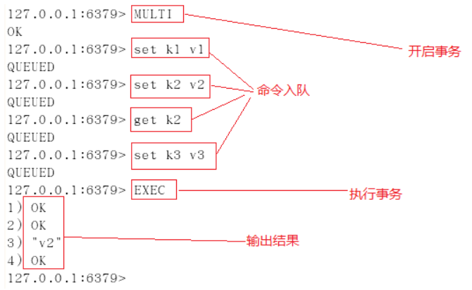 (3) 事务在执行过程中不会被中断,当事务队列中的所有命令都被执行完毕之后,事务才会结束。