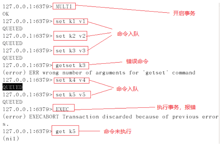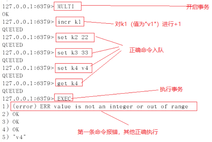 (4)冤头债主 在事务队列中存在语法性错误(类似于 java 的 1/0 的运行时异常),则执行 EXEC 命令时,其他正确命令会被执行,错误命令抛出异常。