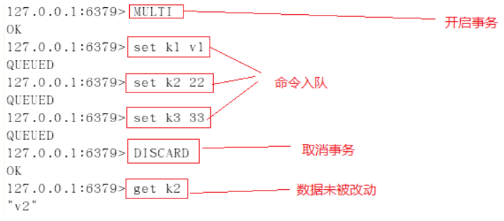 批量操作在发送 EXEC 命令前被放入队列缓存,并不会被实际执行,也就不存在事务内的查询要看到事务里的更新,事务外查询不能看到。
