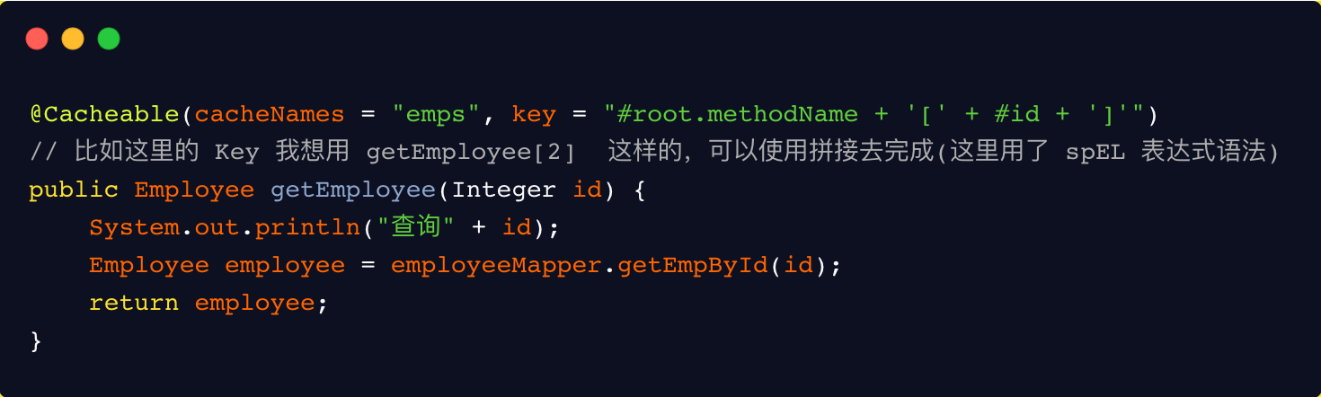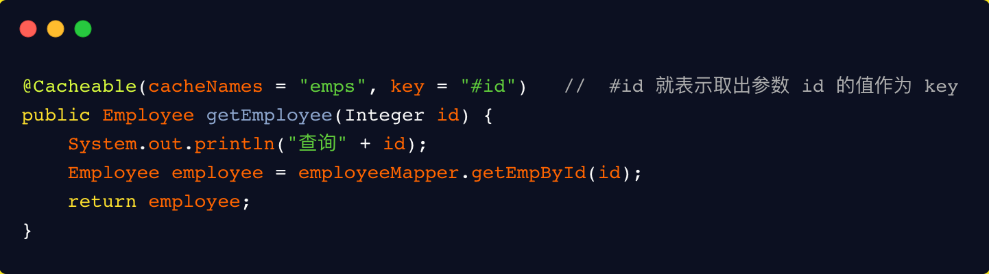 key:缓存数据时使用的 key,可以用它来指定。默认是使用方法参数的值。(这个 key 你可以使用 spEL 表达式来编写) -