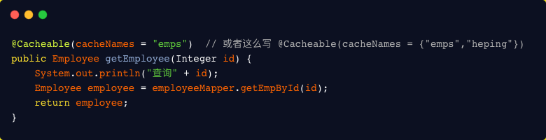 注:这里使用 @Cacheable 注解就可以将运行结果缓存,以后查询相同的数据,直接从缓存中取,不需要调用方法。
