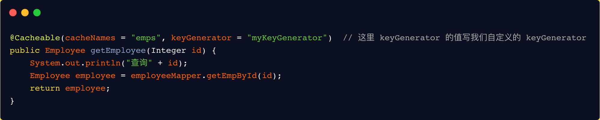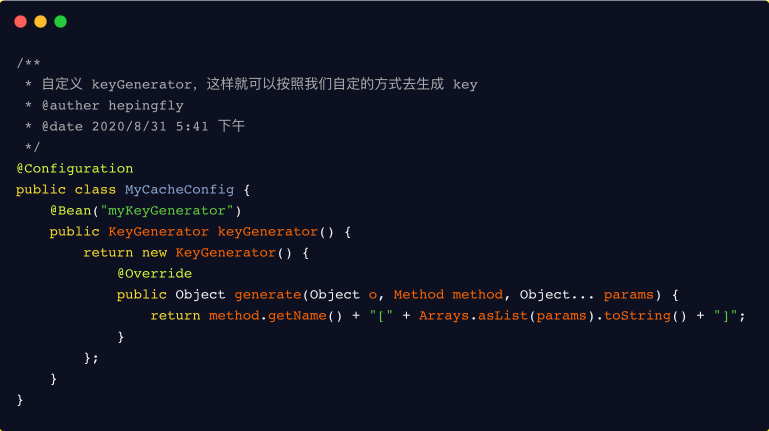 这样放入缓存中的 key 的生成规则就按照你自定义的 keyGenerator 来生成。不过需要注意的是: