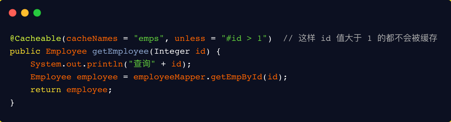unless:否定缓存。当 unless 指定的条件为 true ,方法的返回值就不会被缓存。当然你也可以获取到结果进行判断。(通过#result获取方法结果) -