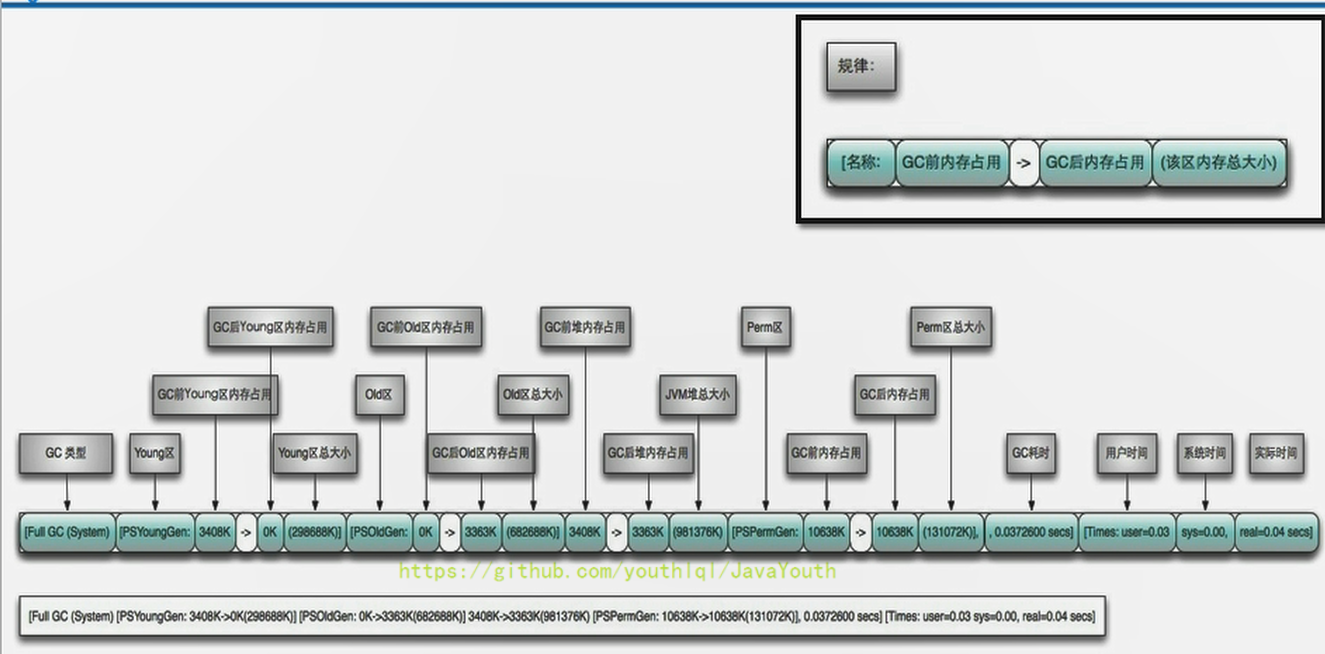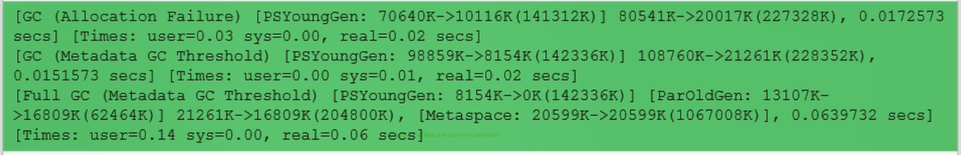 - 括号外:GC回收前年轻代和老年代大小,回收后大小,(年轻代和老年代总大小)