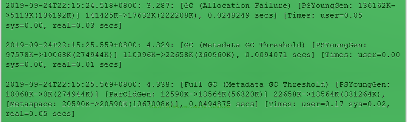 [GC (Allocation Failure) [DefNew: 6322K->668K(9216K), 0.0034812 secs] 6322K->4764K(19456K), 0.0035169 secs] [Times: user=0.00 sys=0.00, real=0.00 secs]