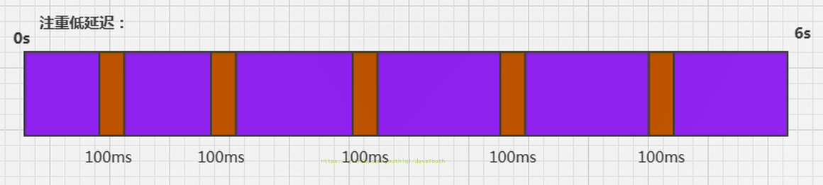 - 暂停时间优先,意味着尽可能让单次STW的时间最短:0.1+0.1 + 0.1+ 0.1+ 0.1=0.5,但是总的GC时间可能会长