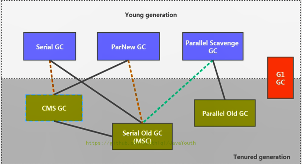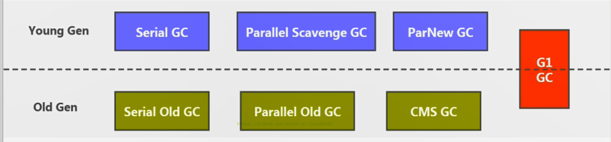 按工作的内存区间分,又可分为年轻代垃圾回收器和老年代垃圾回收器。