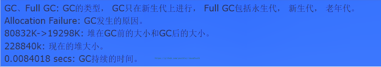 Allocation Failure表明本次引起GC的原因是因为在年轻代中没有足够的空间能够存储新的数据了。