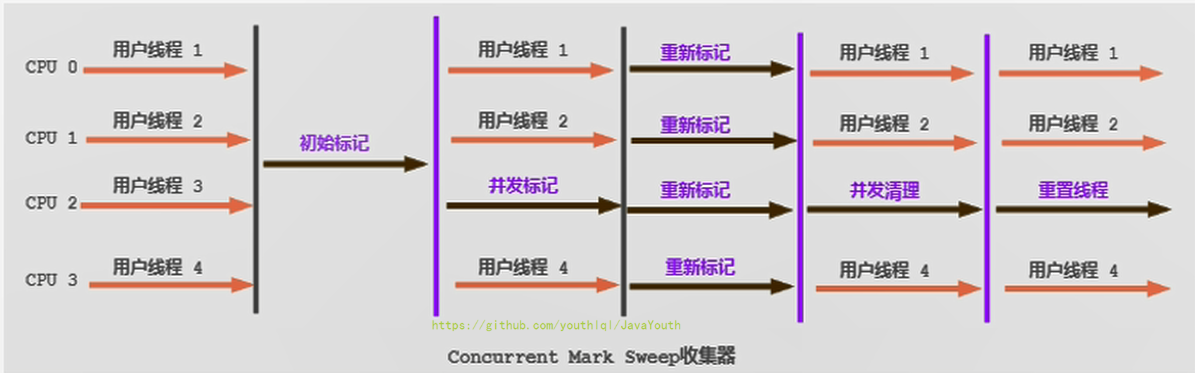 - 并发式垃圾回收器与应用程序线程交替工作,以尽可能减少应用程序的停顿时间。