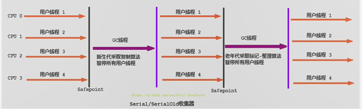 - 串行回收指的是在同一时间段内只允许有一个CPU用于执行垃圾回收操作,此时工作线程被暂停,直至垃圾收集工作结束。