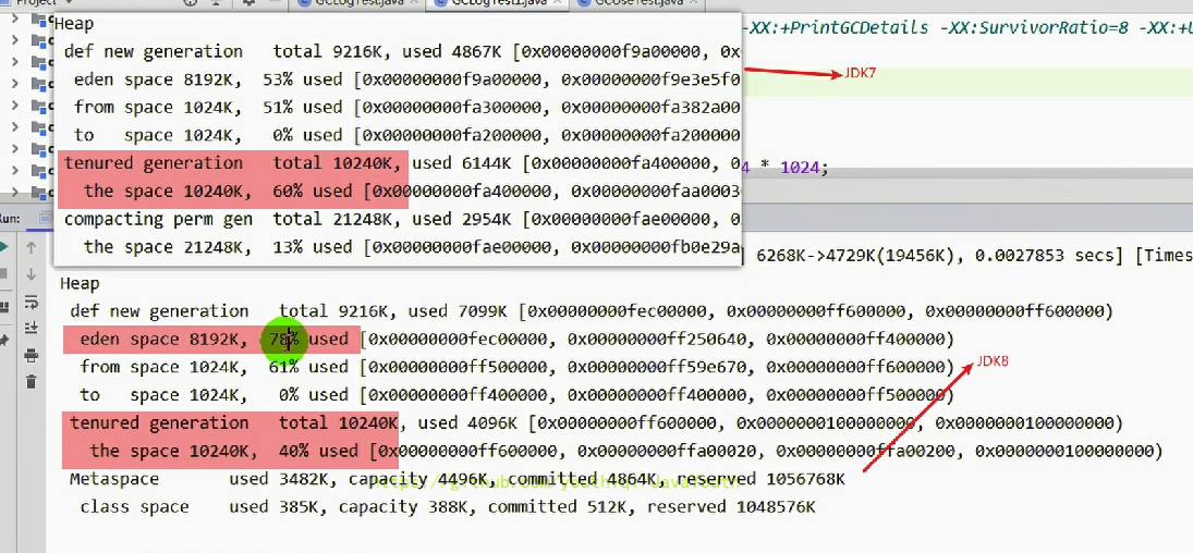 与 JDK7 不同的是,JDK8 直接判定 4M 的数组为大对象,直接怼到老年区去了