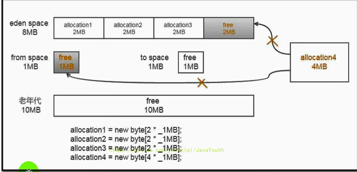 1、首先我们会将3个2M的数组存放到Eden区,然后后面4M的数组来了后,将无法存储,因为Eden区只剩下2M的剩余空间了,那么将会进行一次Young GC操作,将原来Eden区的内容,存放到Survivor区,但是Survivor区也存放不下,那么就会直接晋级存入Old 区
