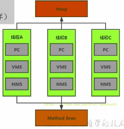 - 线程间共享:堆、堆外内存(永久代或元空间、代码缓存)