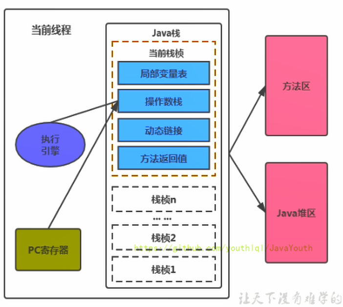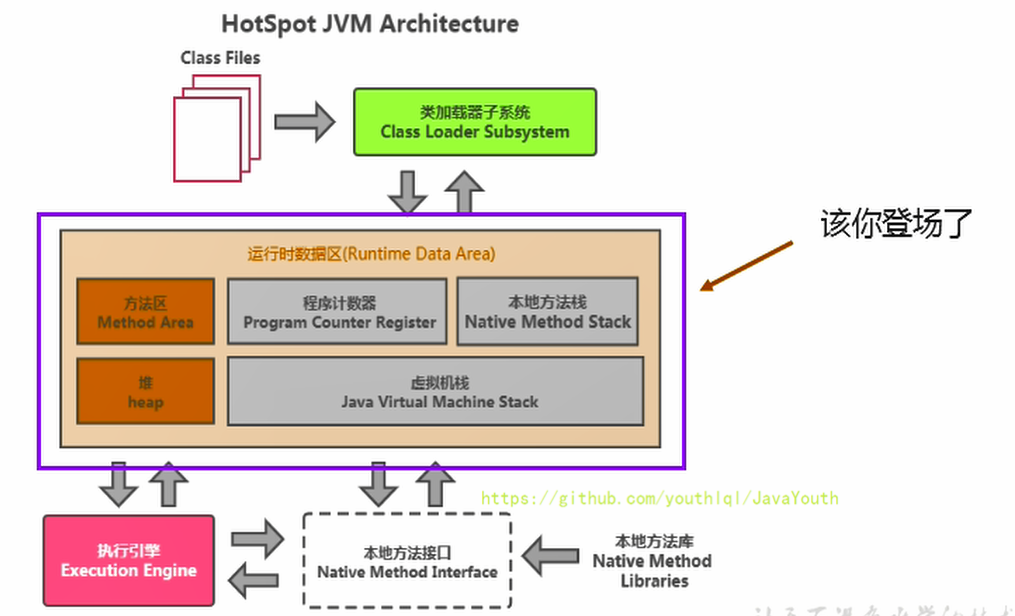 当我们通过前面的:类的加载 ⇒ 验证 ⇒ 准备 ⇒ 解析 ⇒ 初始化,这几个阶段完成后,就会用到执行引擎对我们的类进行使用,同时执行引擎将会使用到我们运行时数据区