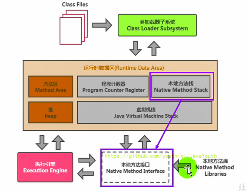 - 它的具体做法是Native Method Stack中登记native方法,在Execution Engine 执行时加载本地方法库。