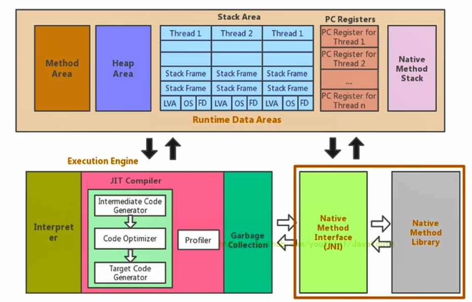- JVM支持着Java语言本身和运行时库,它是Java程序赖以生存的平台,它由一个解释器(解释字节码)和一些连接到本地代码的库组成。