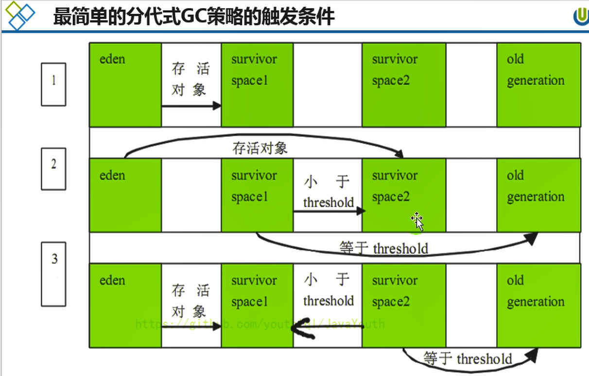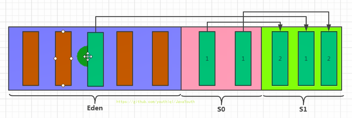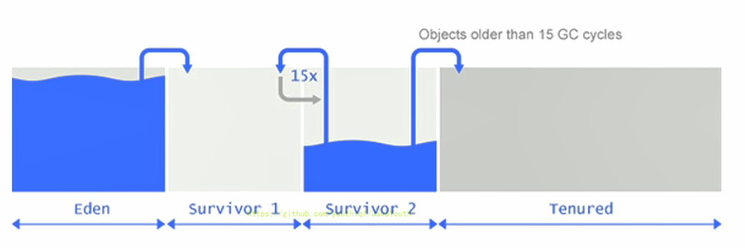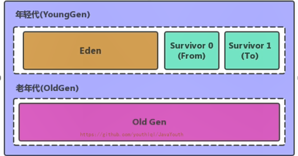 年轻代是对象的诞生、成长、消亡的区域,一个对象在这里产生、应用,最后被垃圾回收器收集、结束生命。