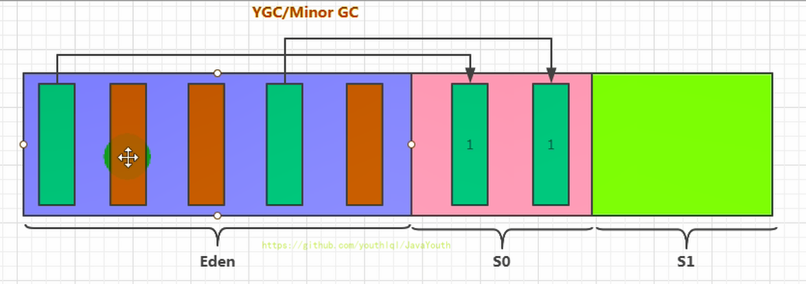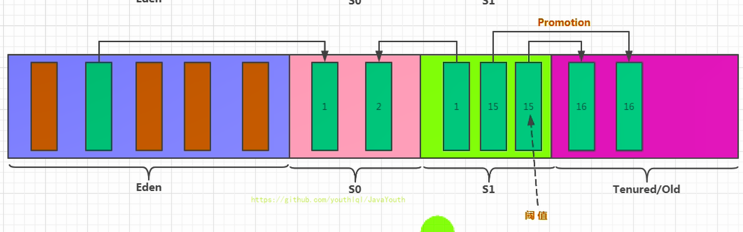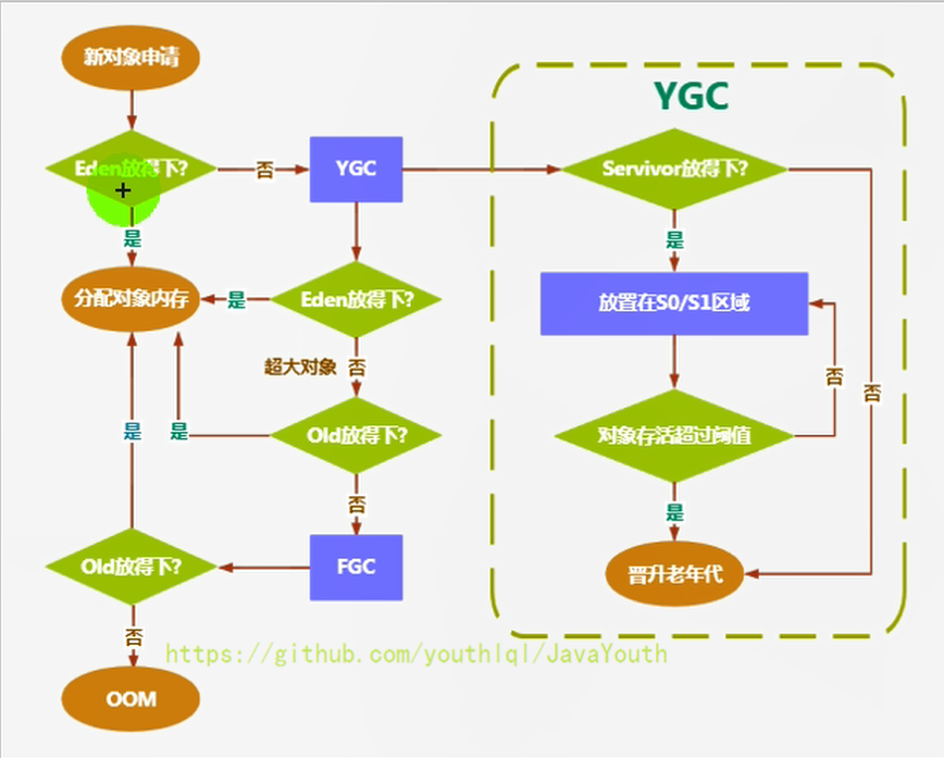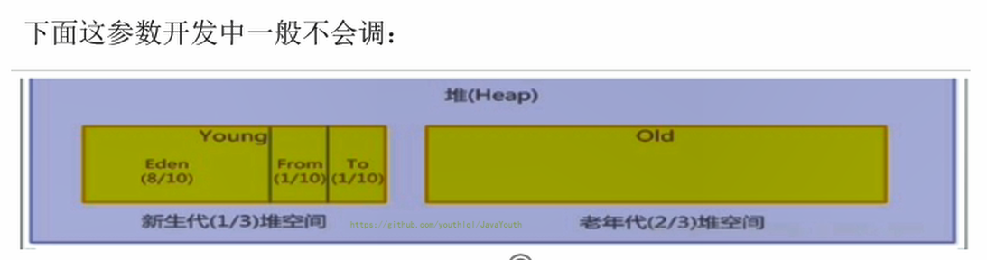 - Young Generation Space 新生区,又被划分为Eden区和Survivor区