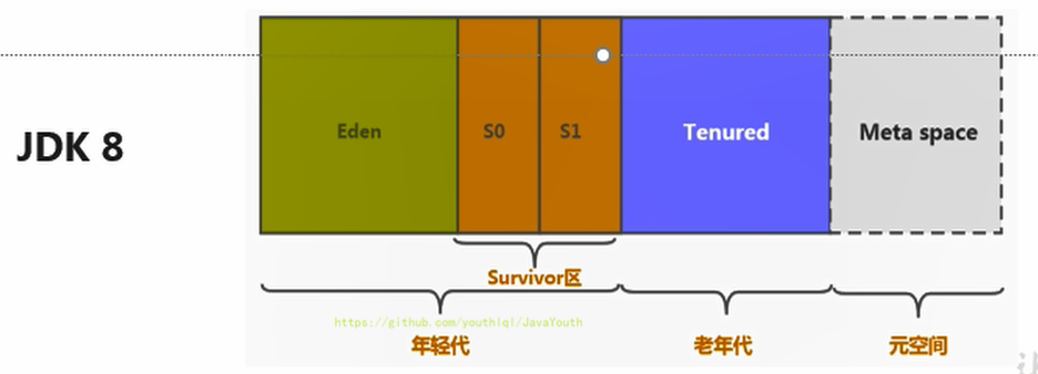 - Java 8及之后堆内存逻辑上分为三部分:新生区+养老区+元空间