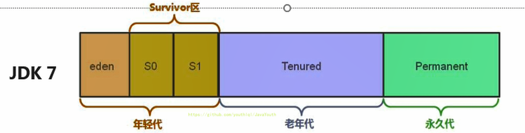 - Java7 及之前堆内存逻辑上分为三部分:新生区+养老区+永久区