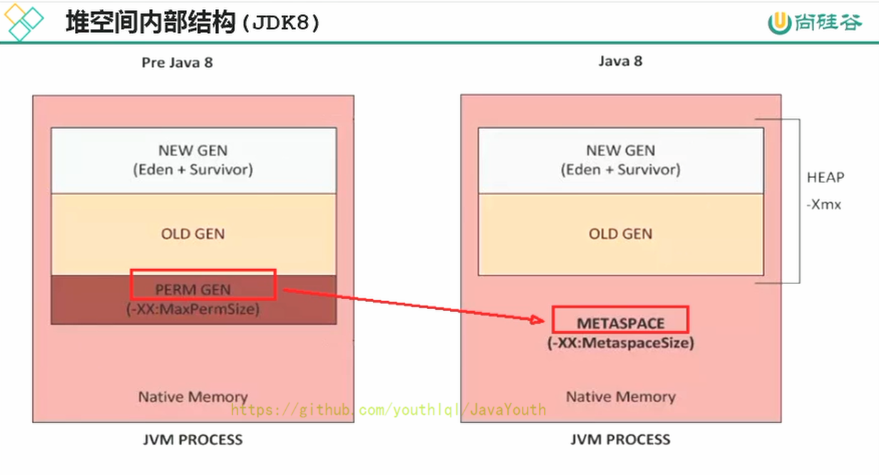 - 堆空间内部结构,JDK1.8之前从永久代 替换成 元空间