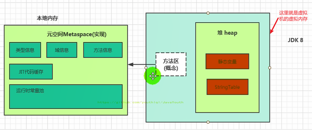 - 《Java虚拟机规范》中明确说明:尽管所有的方法区在逻辑上是属于堆的一部分,但一些简单的实现可能不会选择去进行垃圾收集或者进行压缩。但对于HotSpotJVM而言,方法区还有一个别名叫做Non-Heap(非堆),目的就是要和堆分开。