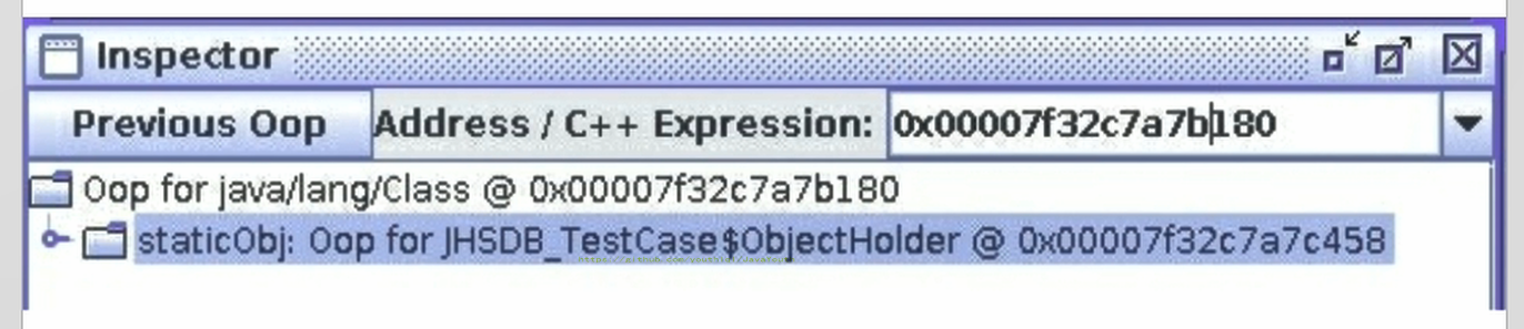 5、接着,找到了一个引用该staticObj对象的地方,是在一个java.lang.Class的实例里,并且给出了这个实例的地址,通过Inspector查看该对象实例,可以清楚看到这确实是一个java.lang.Class类型的对象实例,里面有一个名为staticobj的实例字段: