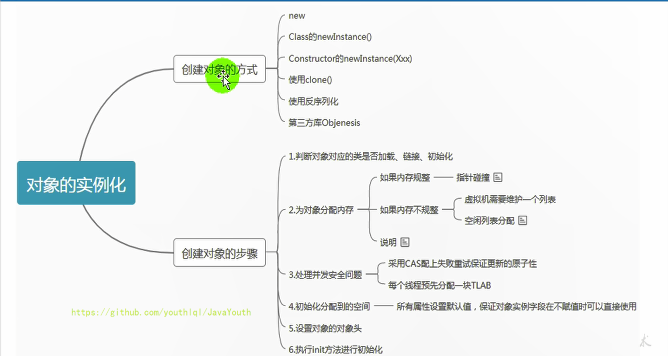 * ① 加载类元信息 - ② 为对象分配内存 - ③ 处理并发问题 - ④ 属性的默认初始化(零值初始化)