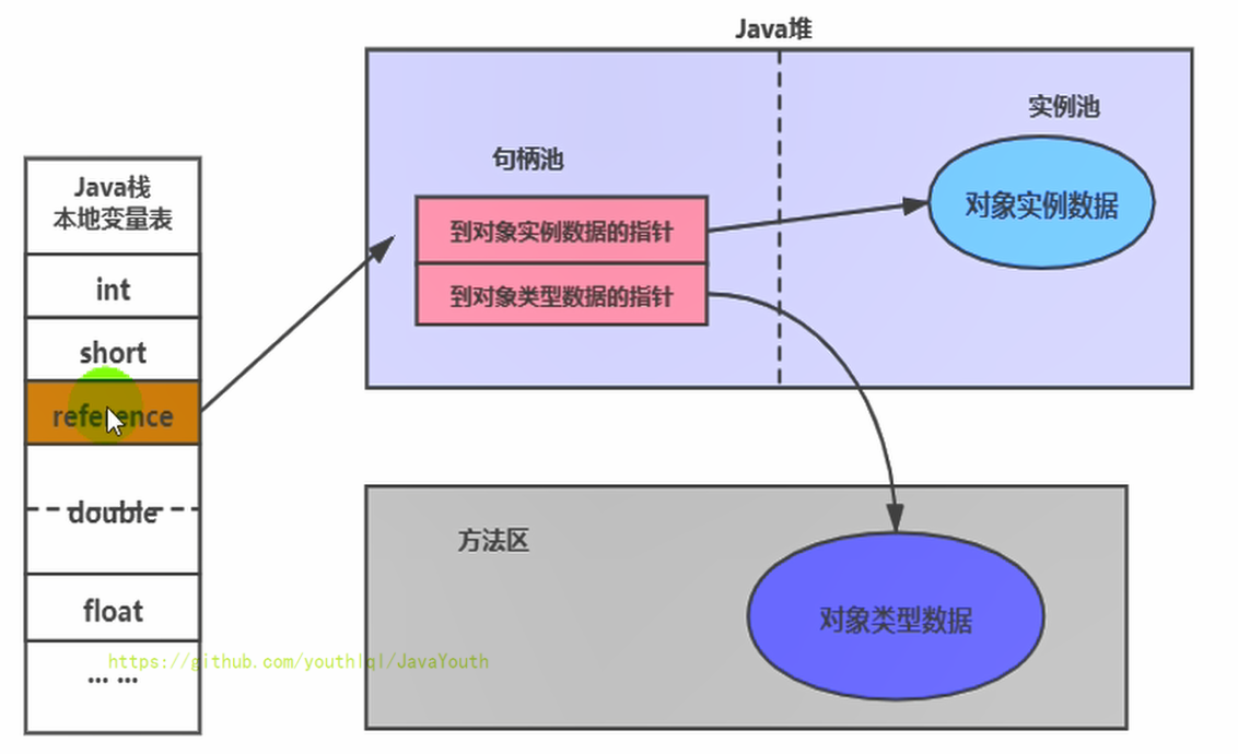 - 优点:reference中存储稳定句柄地址,对象被移动(垃圾收集时移动对象很普遍)时只会改变句柄中实例数据指针即可,reference本身不需要被修改