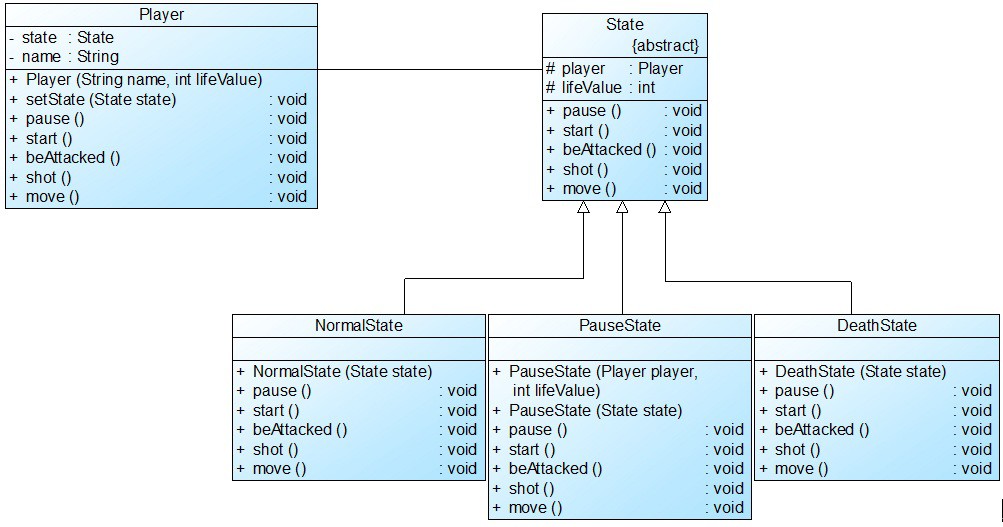 在射击游戏中,游戏角色存在几种不同的状态,如正常状态、暂停状态、阵亡状态等,在不同状态下角色对象的行为不同,可使用状态模式来设计和实现角色状态的转换,类图如图8所示: