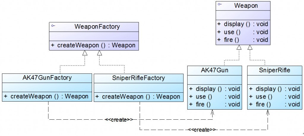 在图3中,WeaponFactory接口表示抽象武器工厂,其子类AK47GunFactory生产AK47Gun,