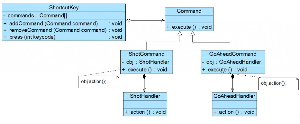 图5 命令模式实例类图 在图5中,ShortcutKey充当请求调用者,在其press()方法中将判断用户按的是哪个按键,再调用命令对象的execute()方法,在具体命令对象的execute()方法中将调用接收者如ShotHandler、GoAheadHandler的action()方法来执行具体操作。在实现时可以将具体命令类类名和键盘按键的键码(Keycode)存储在配置文件中,配置文件格式如下所示: