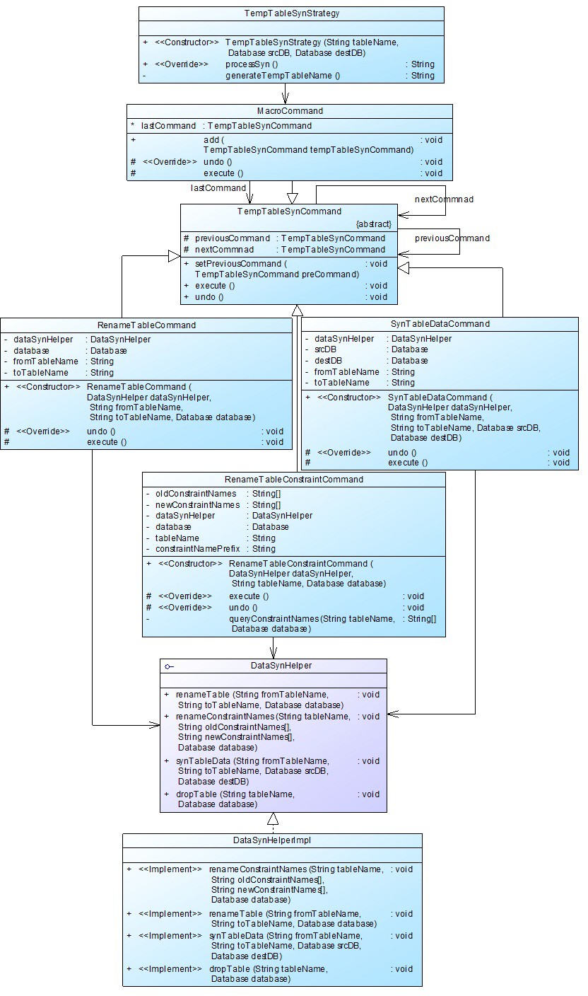 在图9中,TempTableSynCommand充当抽象命令,MacroCommand充当宏命令类, RenameTableCommand、SynTableDataCommand和RenameTableConstraintCommand充当具体命令,TempTableSynStrategy充当请求调用者,DataSynHelper充当请求接收者,在DataSynHelper 中定义了辅助实现临时表方式同步的一些方法,在命令类中将调用这些方法。在TempTableSynCommand中声明了公共的execute()方法,并提供了回滚方法undo(),其子类实现具体的执行操作与恢复操作。DataSynHelper接口声明了进行数据库操作的方法,在其子类DataSynHelperImpl中实现了这些方法。