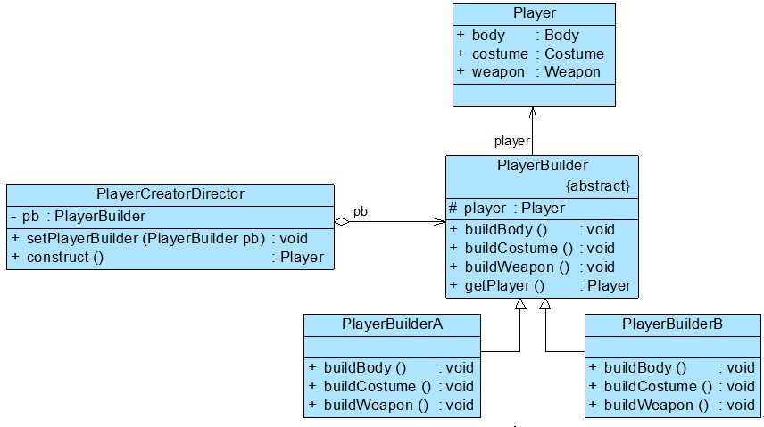 在图2中,PlayerCreatorDirector充当指挥者角色,PlayerBuilder是抽象建造者,其子类PlayerBuilderA和PlayerBuilderB是具体建造者,用于创建不同的游戏角色,Player是所创建的完整产品,即完整的游戏角色,它包含形体(body)、服装(costume)和武器(weapon)等组成部分。