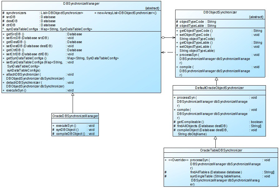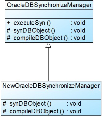由于Oracle数据库对象类型较多,而大部分对象的处理逻辑大同小异,只有少部分对象类型同步结构后需要重新编译,因此在设计DefaultOracleObjectSynchronizer类时也可以使用模板方法