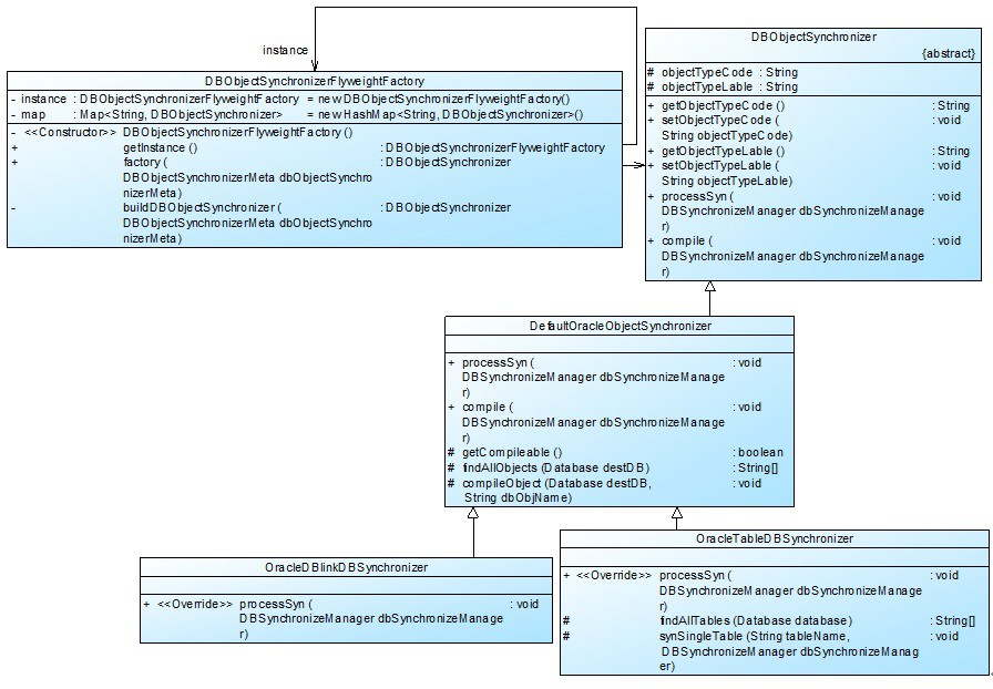 在图5中,DBObjectSynchronizerFlyweightFactory充当数据库对象同步执行者的享元工厂,同步对象执行类DBObjectSynchronizer充当抽象享元,其间接子类OracleDBlinkDBSynchronizer、OracleTableDBSynchronizer等充当具体享元(由于篇幅问题,未将所有数据库对象类一一列 出)。