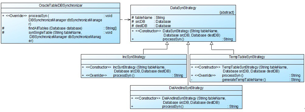 在图8中,Oracle表同步对象类OracleTableDBSynchronizer充当环境类,DataSynStrategy充当抽象策略类,其子类IncSynStrategy、DelAndInsSynStrategy和TempTableSynStrategy充当具体策略类。