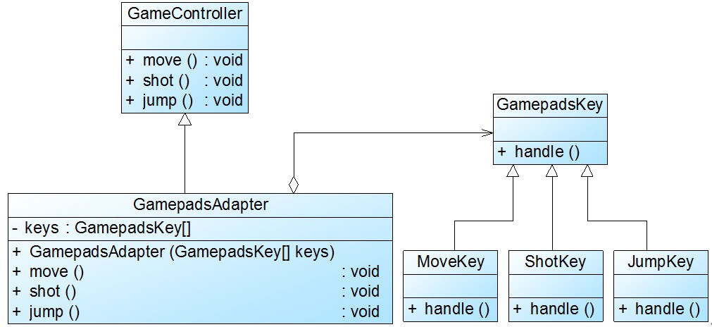 在图9中,GamepadsAdapter充当适配器,它将游戏手柄中按键(GamepadsKey)的方法适配到现有系统中,在其move()方法中可以调用MoveKey类的handle()方法,在其shot()方法中可以调用ShotKey的handle()方法,从而实现通过手柄来控制游戏运行。