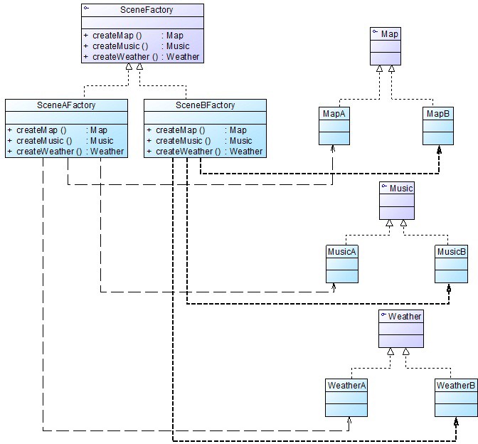 在图1中,SceneFactory充当抽象工厂,其子类SceneAFactory等充当具体工厂,可以创建具体的地图(Map)、背景音乐(Music)和天气(Weather)等产品对象,如果需要增加新场景,只需增加新的具体场景工厂类即可。