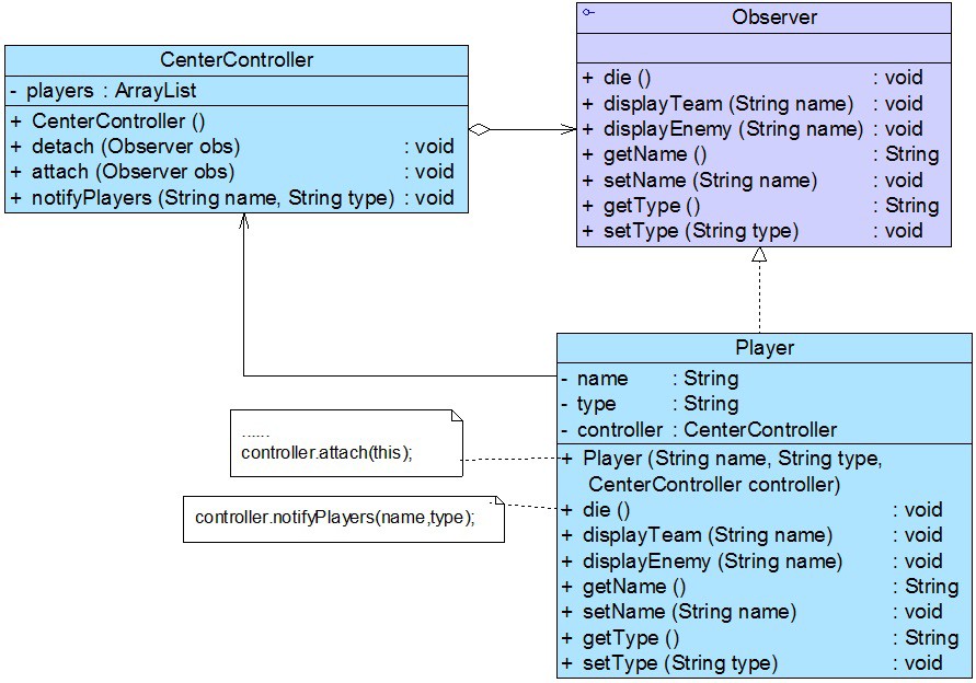 在图6中,CenterController充当观察目标,Observer充当抽象观察者,Player充当具体观察者。在Player类中,name属性表示角色名,type属性表示角色类型,如”战队A”或”战队B”等。Player的die()方法执行时将调用CenterController的notifyPlayers()方法,在notifyPlayers()方法中调用其他Player对象的提示方法,如果是队友阵亡则调用displayTeam(),如果是敌人阵亡则调用displayEnemy();还将调用detach()方法删除阵亡的Player对象,其中CenterController类的notifyPlayers()方法代码片段如下所示: