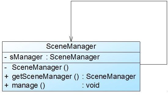 为了节约系统资源,在联机射击游戏中可以使用单例模式来实现一些管理器(Manager),如场景管理器(SceneManager)、声音管理器(SoundManager)等,如图7所示的场景管理器SceneManager类: