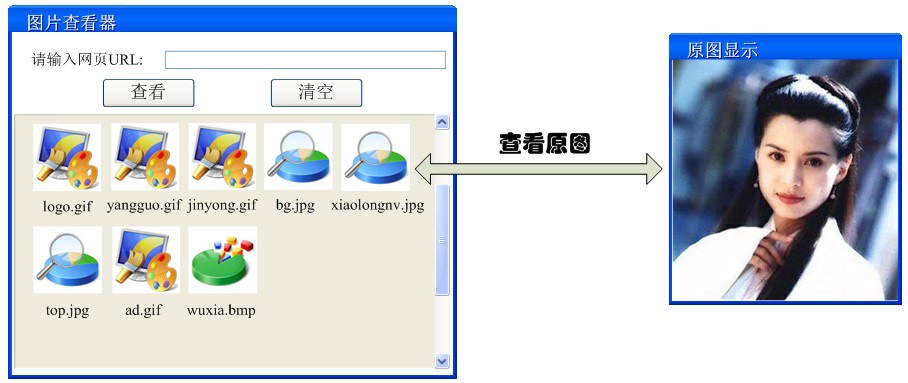 某软件公司欲开发一款基于C/S的网络图片查看器,具体功能描述如下:用户只需在图片查看器中输入网页URL,程序将自动将该网页所有图片下载到本地,考虑到有些网页图片比较多,而且某些图片文件比较大,因此将先以图标的方式显示图片,不同类型的图片使用不同的图标,并且在图标下面标注该图片的文件名,用户单击图标后可查看真正的图片,界面效果如图15-7所示。试使用虚拟代理模式设计并实现该图片查看器。