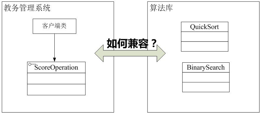 通过分析,我们不难得知,现在Sunny软件公司面对的问题有点类似本章最开始所提到的电压问题,成绩操作接口ScoreOperation好比只支持20V电压的笔记本,而算法库好比220V的家庭用电,这两部分都没有办法再进行修改,而且它们原本是两个完全不相关的结构,如图9-2所示: