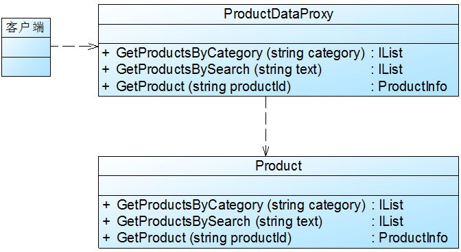 与业务逻辑层Product对象的GetProductsByCategory()方法相比,上述代码增加了缓存机制。当缓存内不存在相关数据项时,则直接调用业务逻辑层Product的GetProductsByCategory()方法来获取数据,并将其与对应的AggregateCacheDependency对象一起存储在缓存中。在ProductDataProxy类的每一个业务方法中都实例化了Product类,再调用Product类的相应方法,因此ProductDataProxy与Product之间属于依赖关系,这是标准代理模式的一种变形,可以按照标准代理模式对其进行改进,包括引入高层的抽象接口。