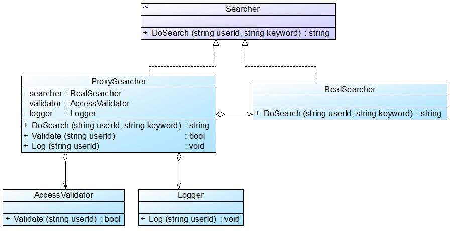 }(5) ProxySearcher:代理查询类,充当代理主题角色,它是查询代理,维持了对RealSearcher对象、AccessValidator对象和Logger对象的引用。
