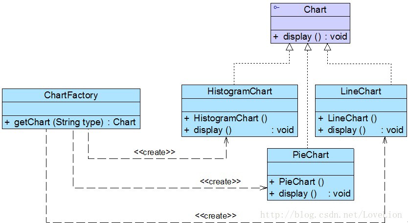 在图2中,Chart接口充当抽象产品类,其子类HistogramChart、PieChart和LineChart充当具体产品类,ChartFactory充当工厂类。完整代码如下所示: