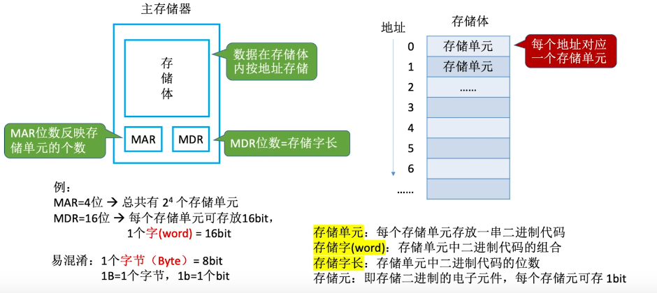 存储字长:一个存储单元存储的二进制代码的长度。等于 MDR 的位数, 它们都必须是字节的整数倍。