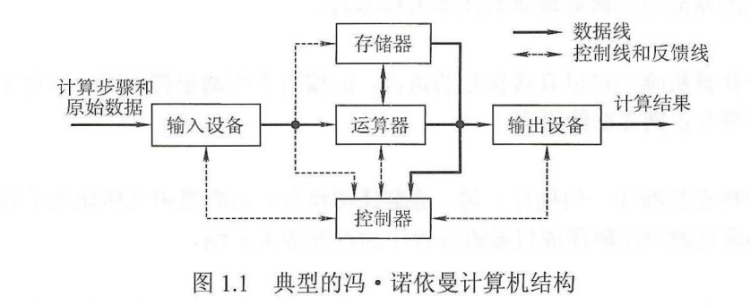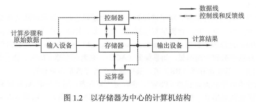 图 1.4 所示为冯・诺依曼结构的模型机。CPU 包含 ALU、通用寄存器组 GPRs、标志寄存器、控制器、指令寄存器 IR、程序计数器 PC、存储器地址寄存器 MAR 和存储器数据寄存器 MDR。图中从控制器送出的虚线就是控制信号,可以控制如何修改 PC 以得到下一条指令的地址,可以控制 ALU 执行什么运算,可以控制主存是进行读操作还是写操作 (读 / 写控制信号)。