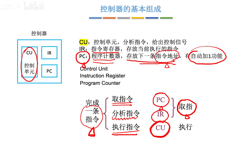 <5> 控制器,控制器是计算机的指挥中心,有其指挥各部件自动协调第进行工作,现代计算机将运算器和控制器集成到一个芯片上,合成为中央处理器,简称 CPU。有程序计数器 (PC)、指令寄存器(IR) 和控制单元(CU)。
